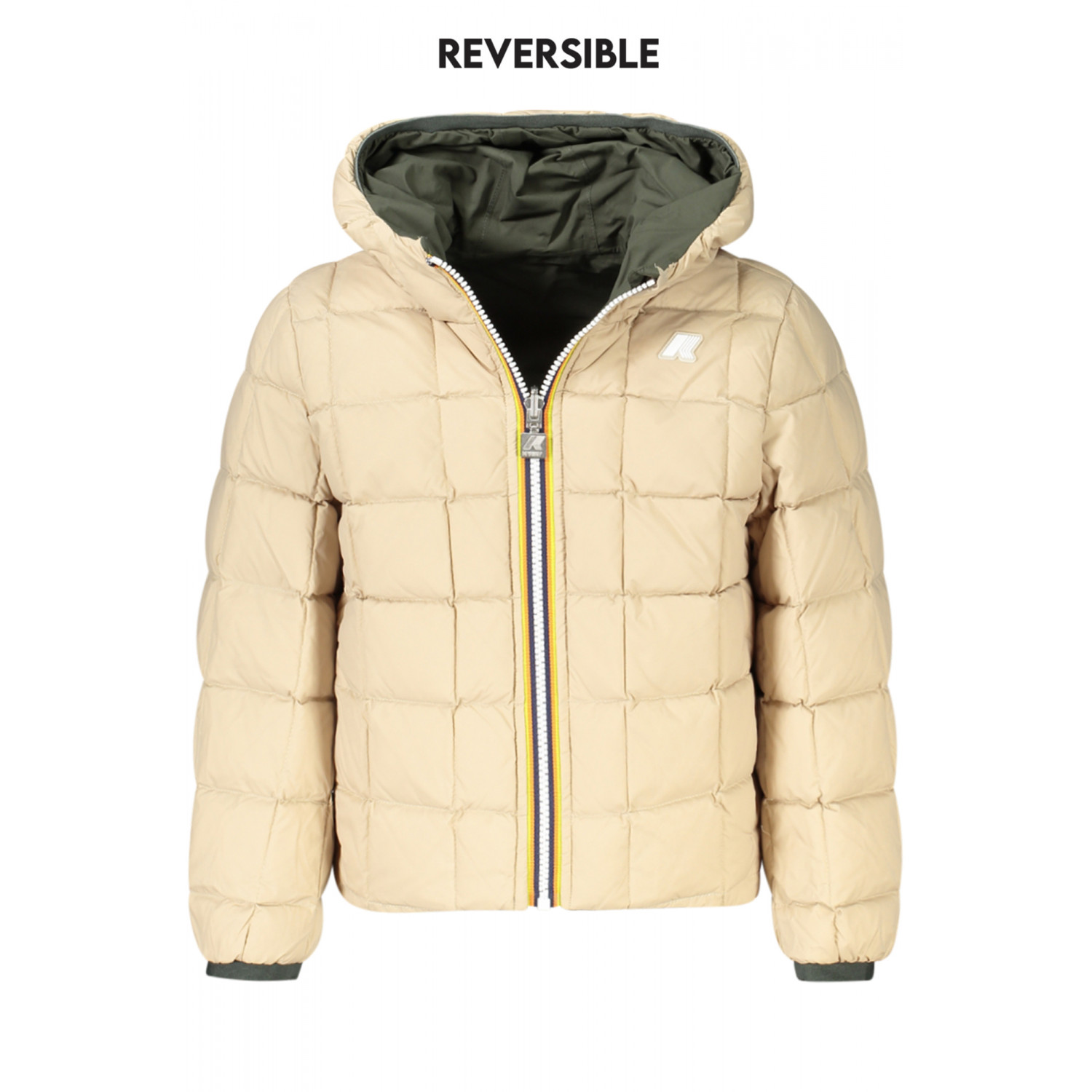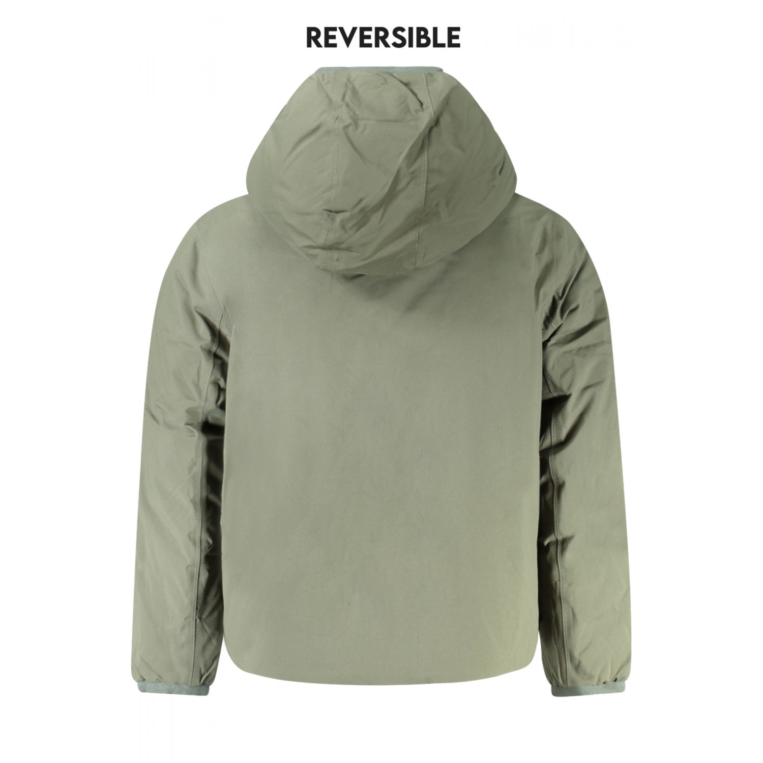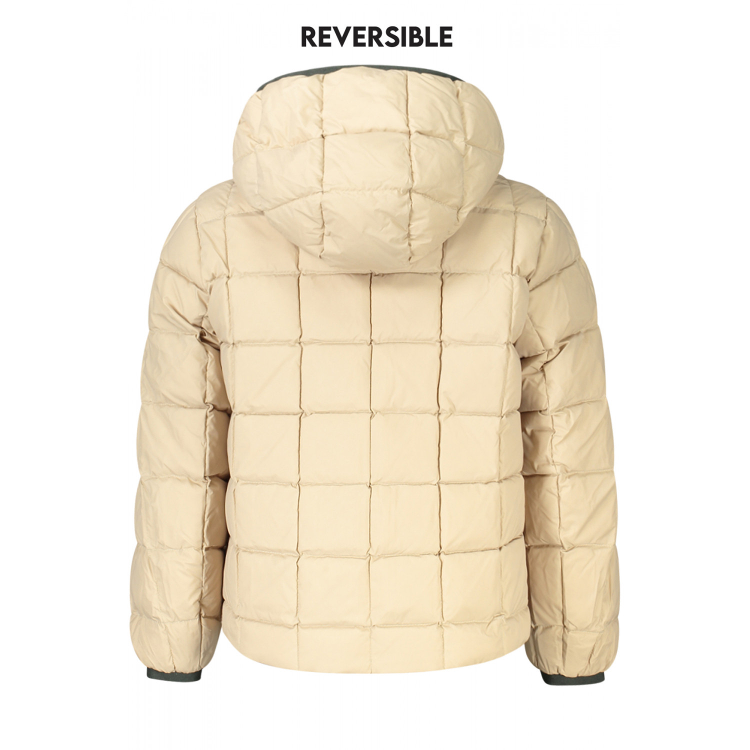 LANGÄRMELIGE JACKE MIT KAPUZE, WENDBAR GRÜN/BEIGE, GEFÜLLT MIT ENTENDAUNEN, 2 AUSSENTASCHEN, 2 INNENTASCHEN, KONTRASTDETAILS, APPLIKATION, REISSVERSCHLUSS, LOGO