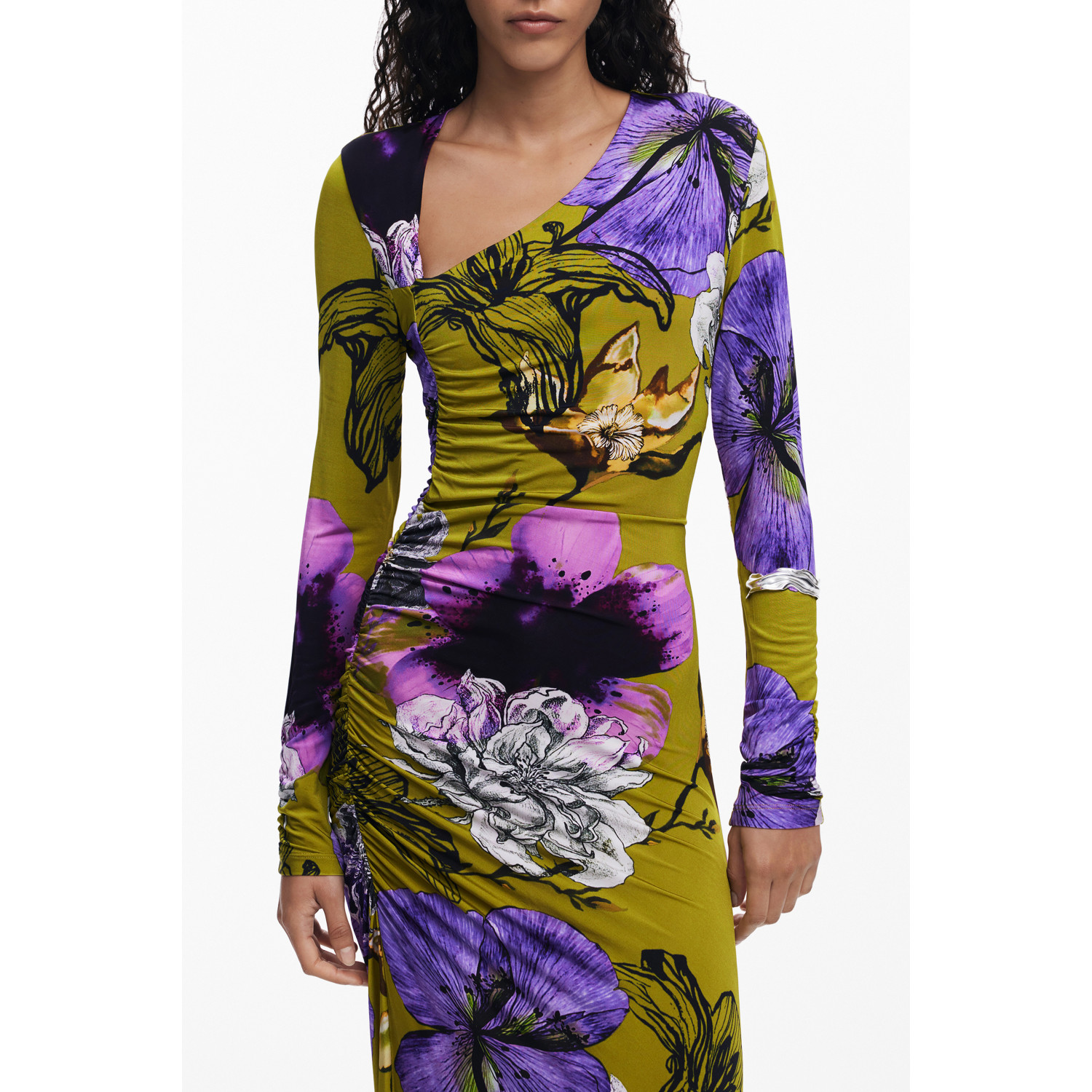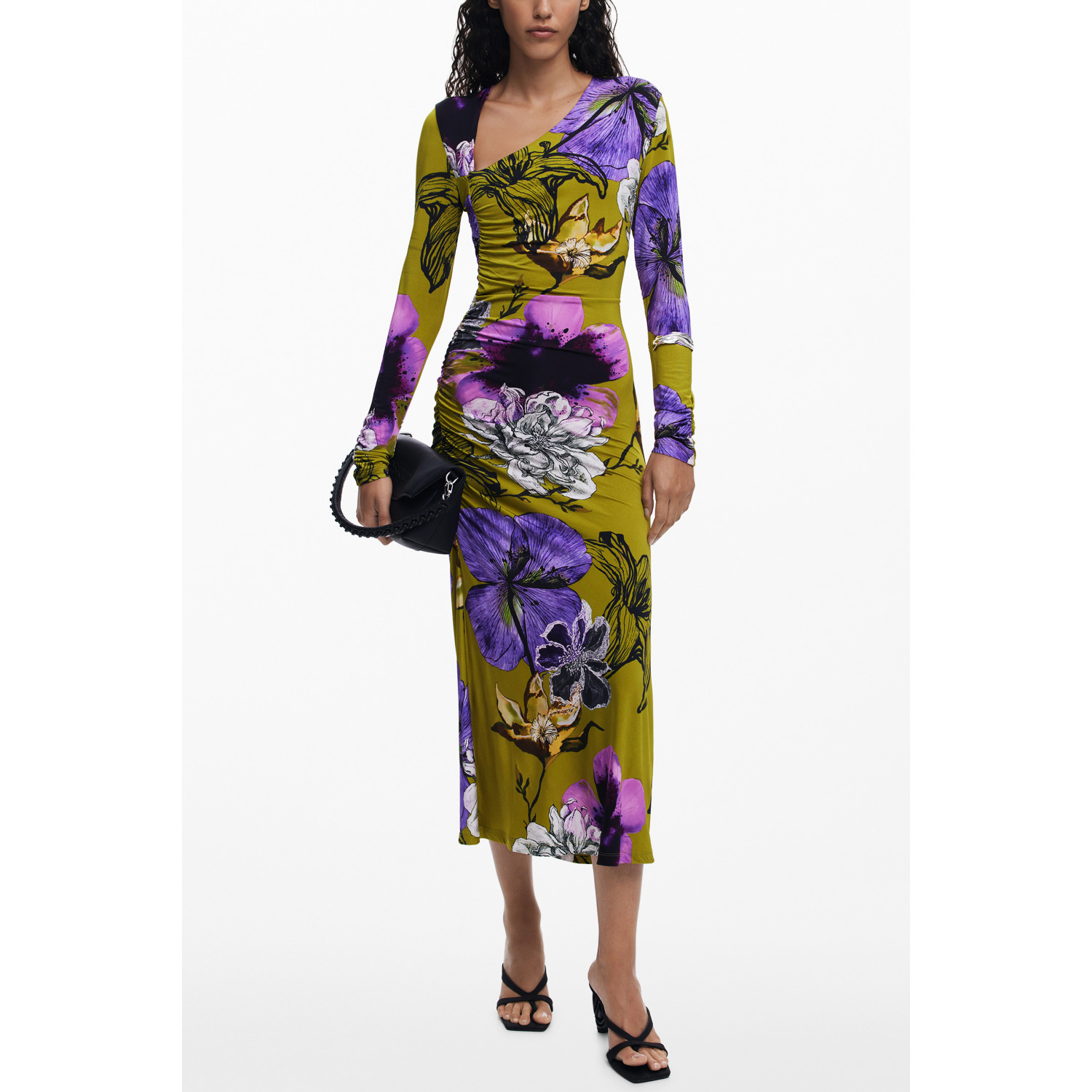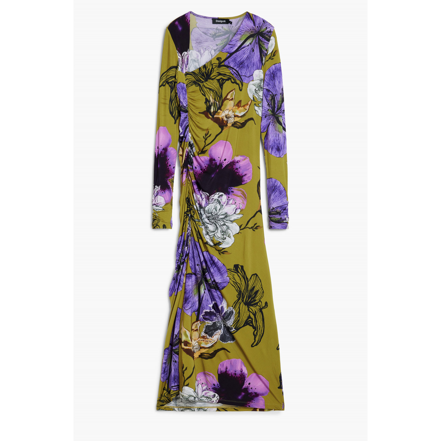 LANGES GEMUSTERTES KLEID, LANGE ÄRMEL, AUSSCHNITT, AUSGESCHNITTENER AUSSCHNITT, KONTRASTIERENDE DETAILS, LOGO