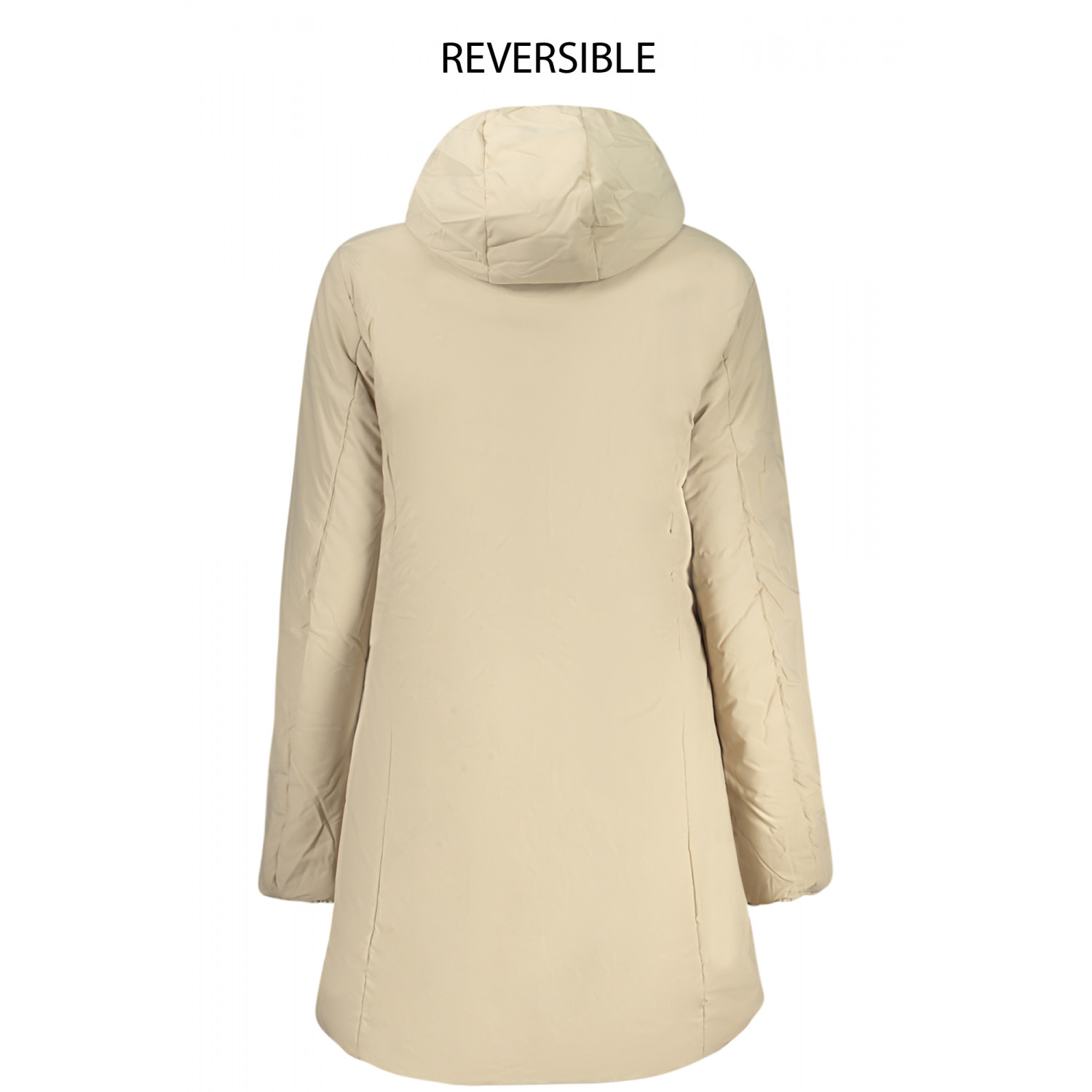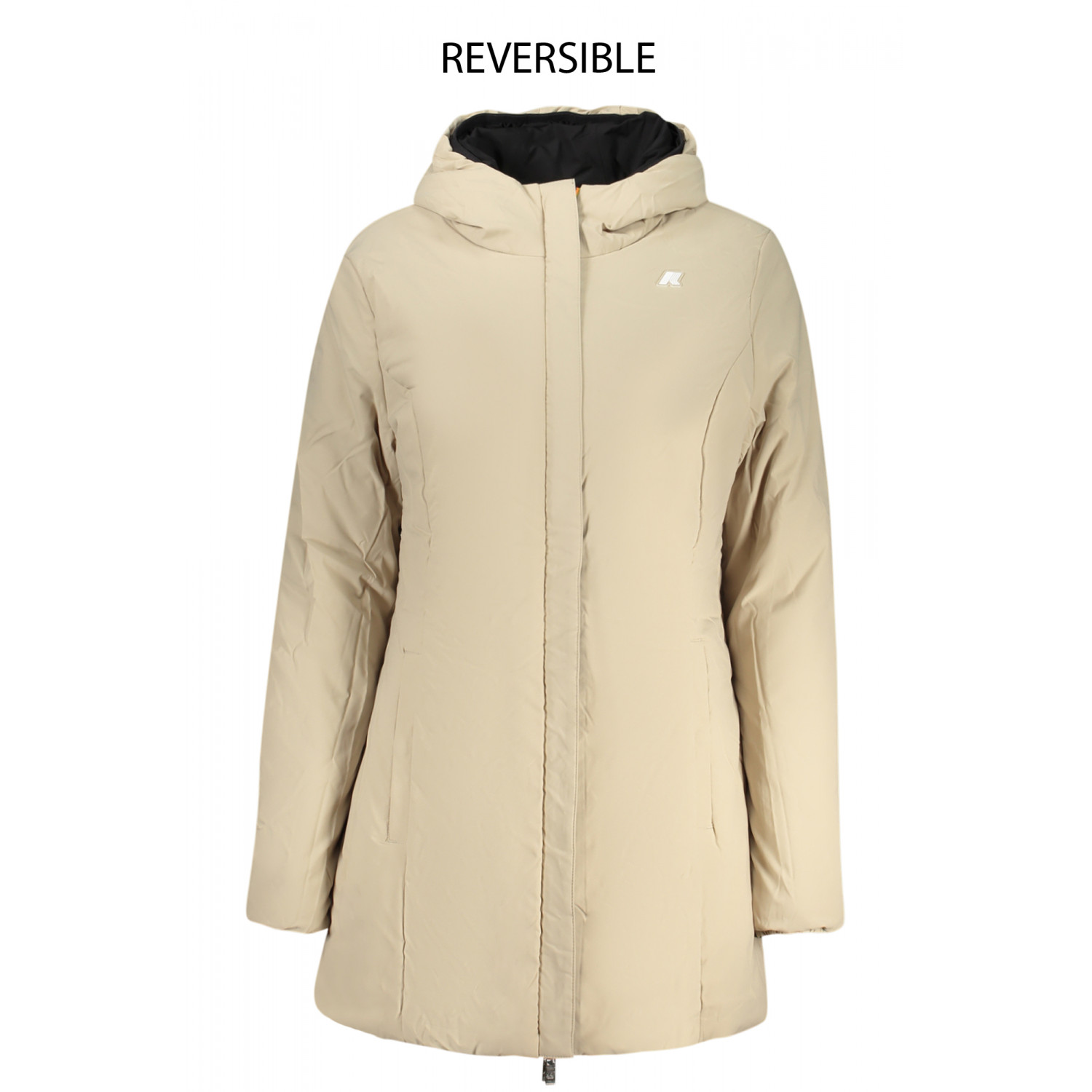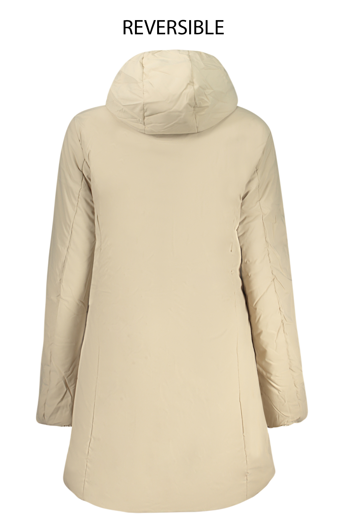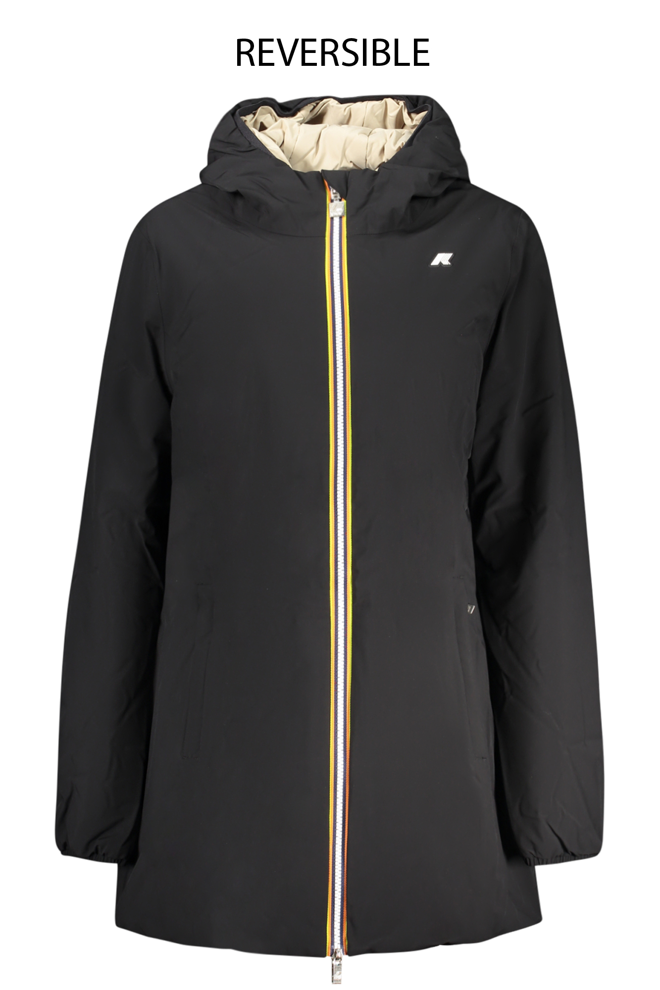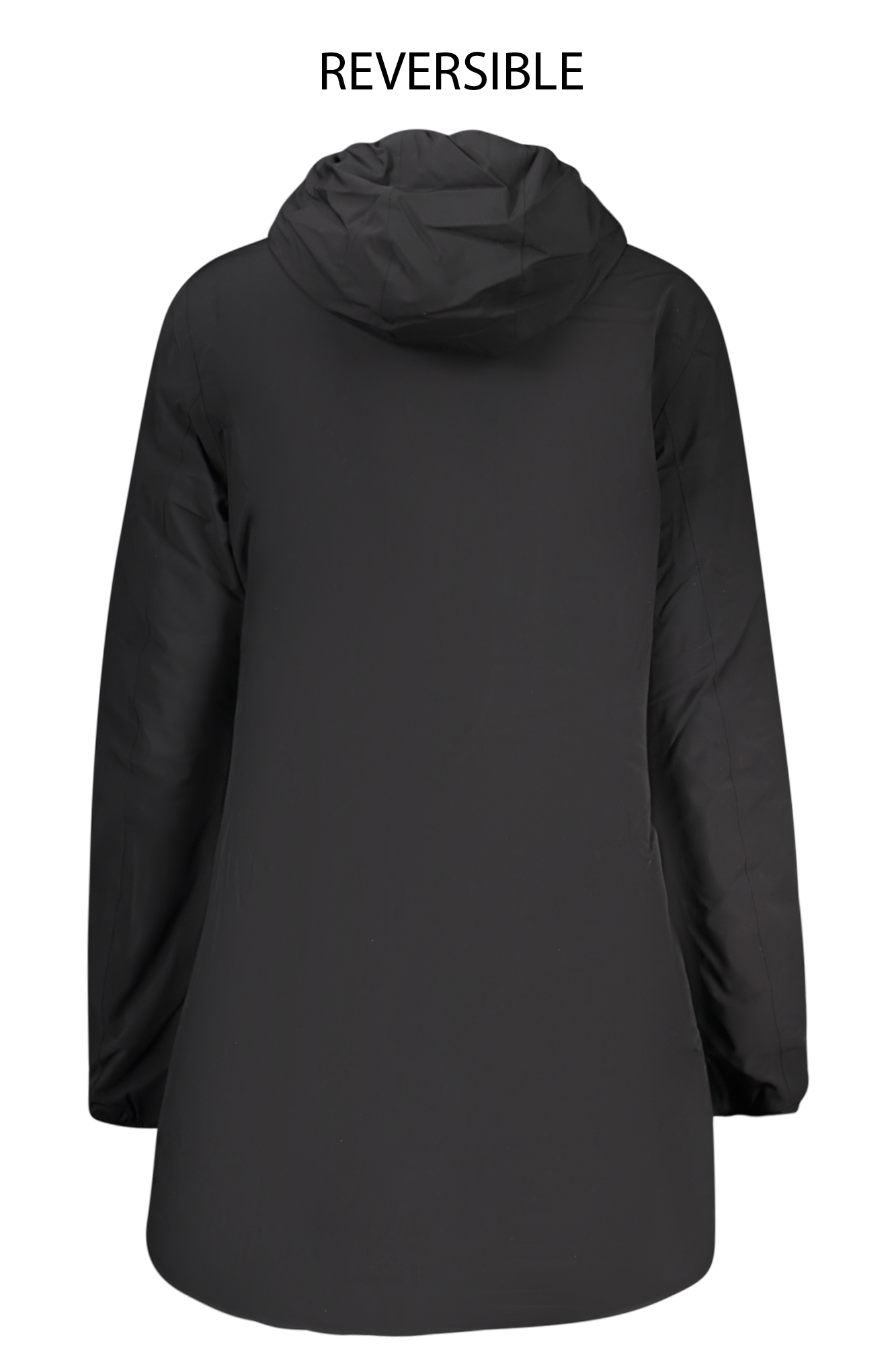GIUBBOTTO LUNGO MANICHE LUNGHE CON CAPPUCCIO, REVERSIBILE NERO/BEIGE, IMBOTTITO, 2 TASCHE ESTERNE, 2 TASCHE INTERNE, DETTAGLI A CONTRASTO, ZIP, APPLICAZIONE, LOGO