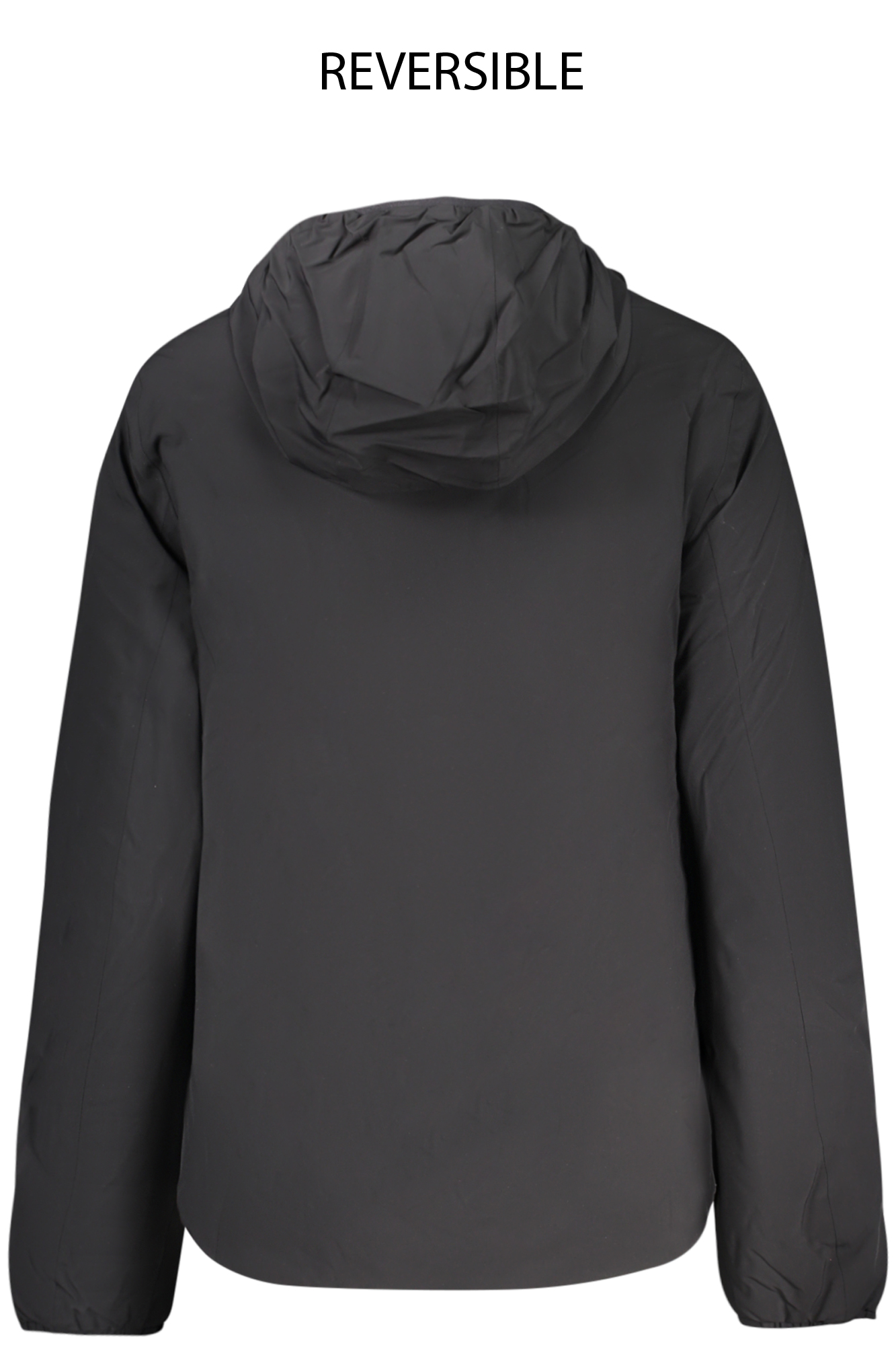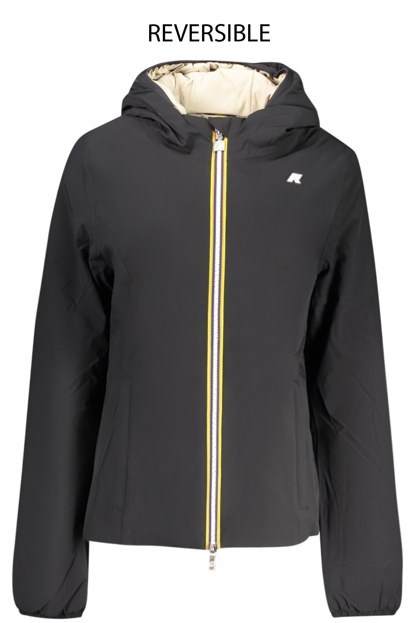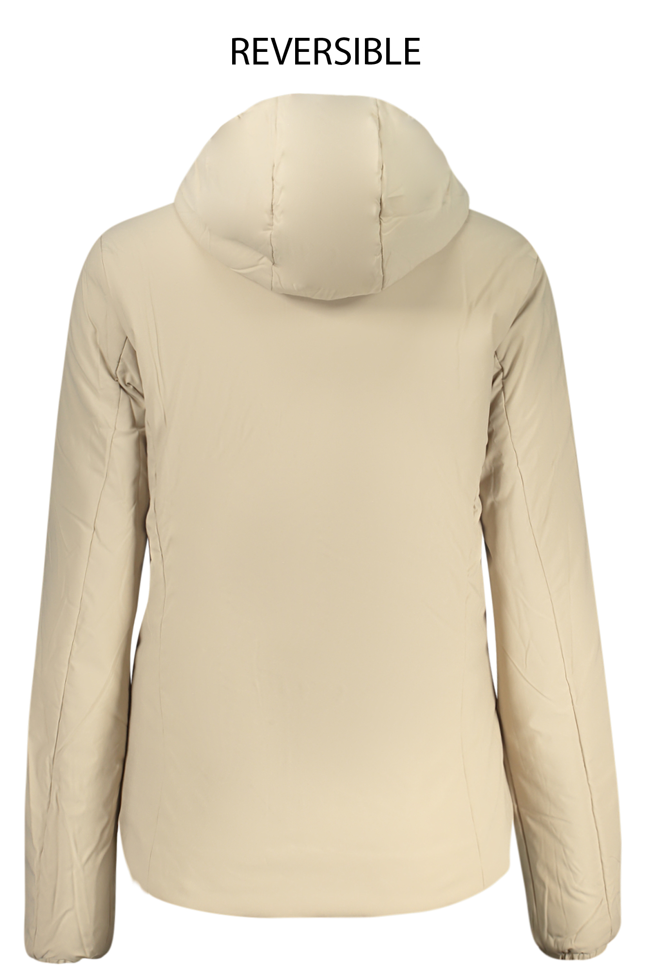 GIUBBOTTO MANICHE LUNGHE CON CAPPUCCIO, REVERSIBILE NERO/BEIGE, IMBOTTITO, 2 TASCHE ESTERNE, 2 TASCHE INTERNE, DETTAGLI A CONTRASTO, ZIP, APPLICAZIONE, LOGO
