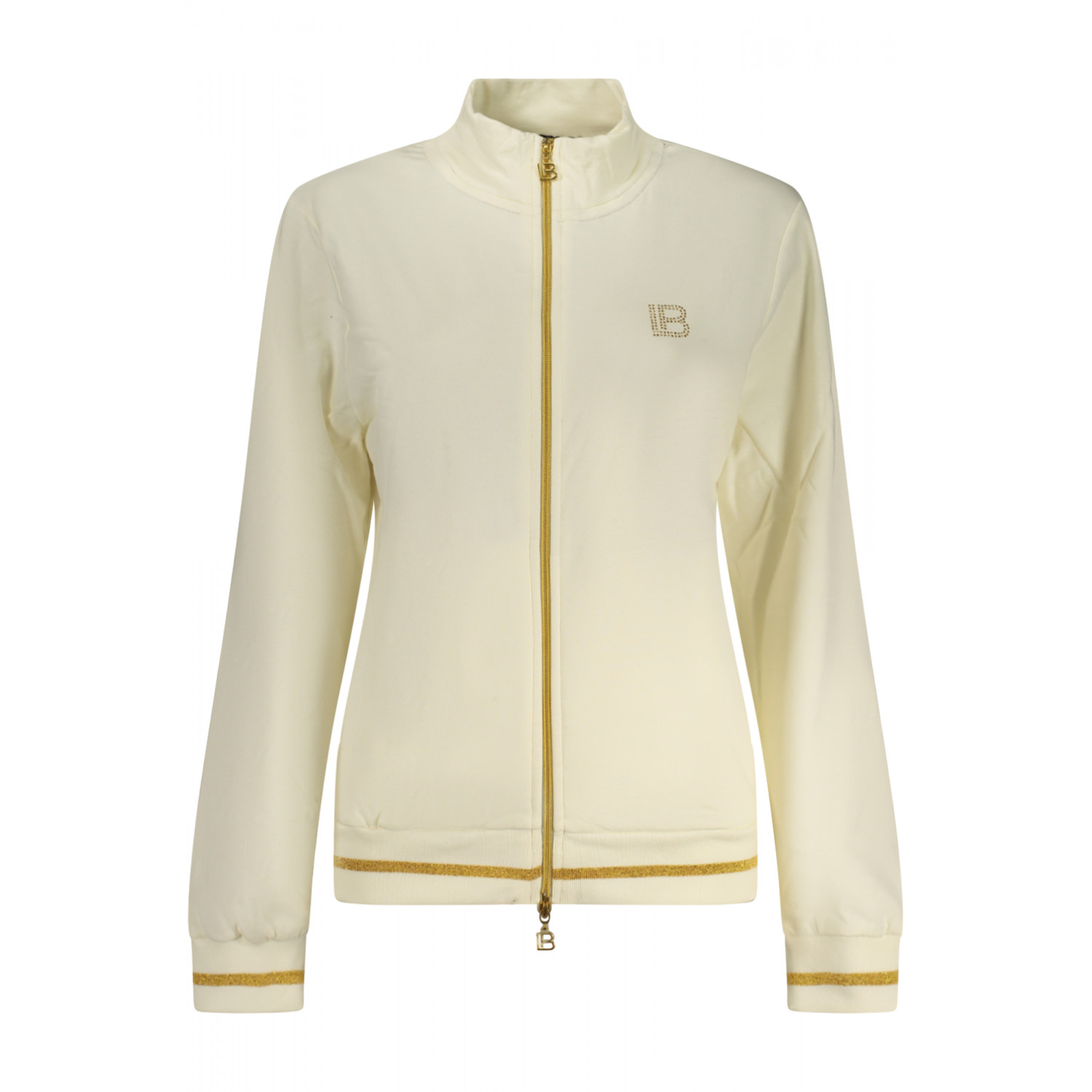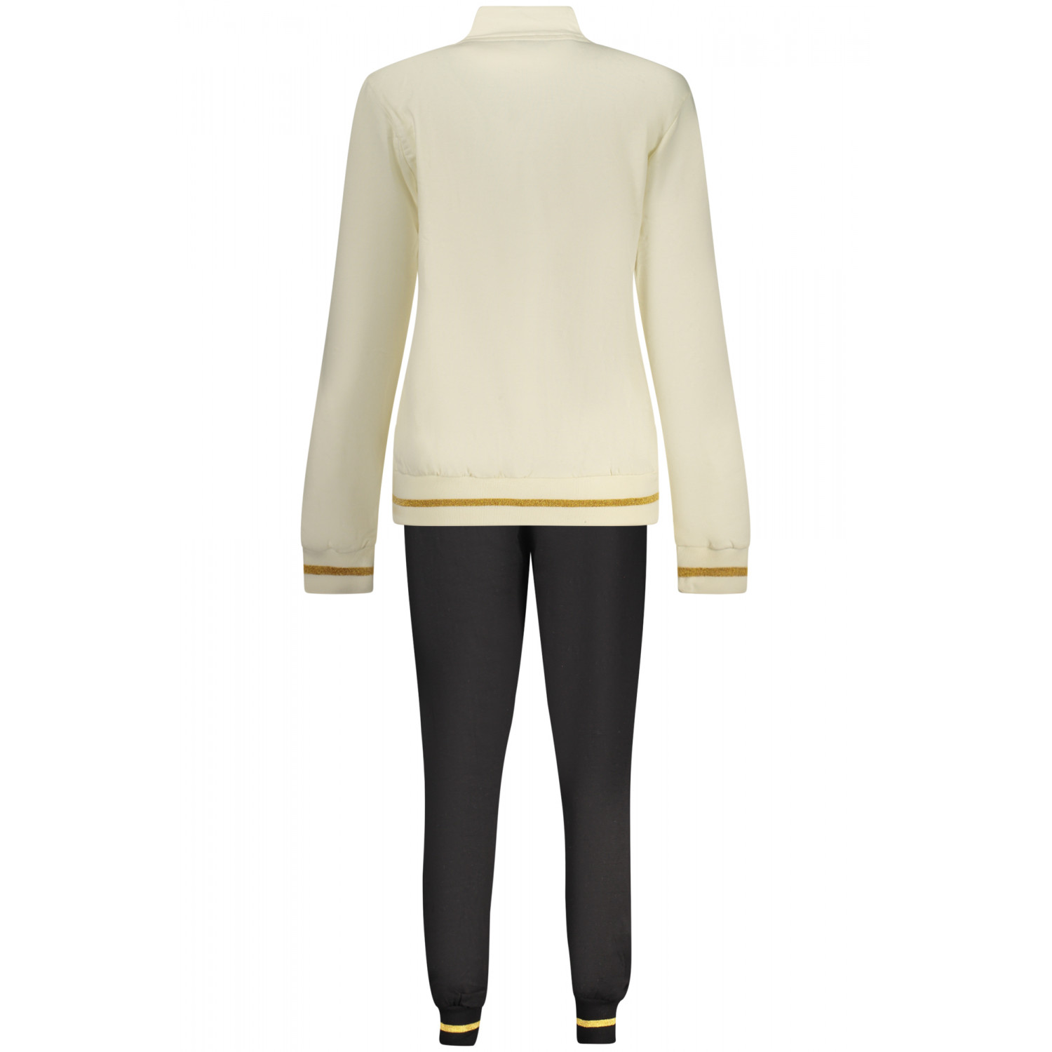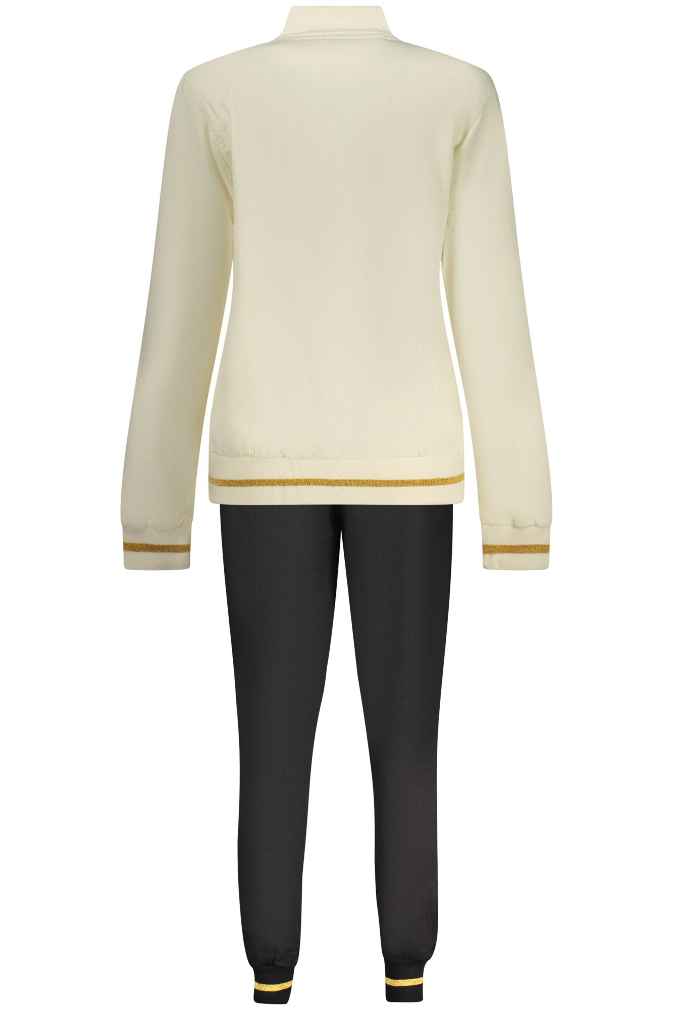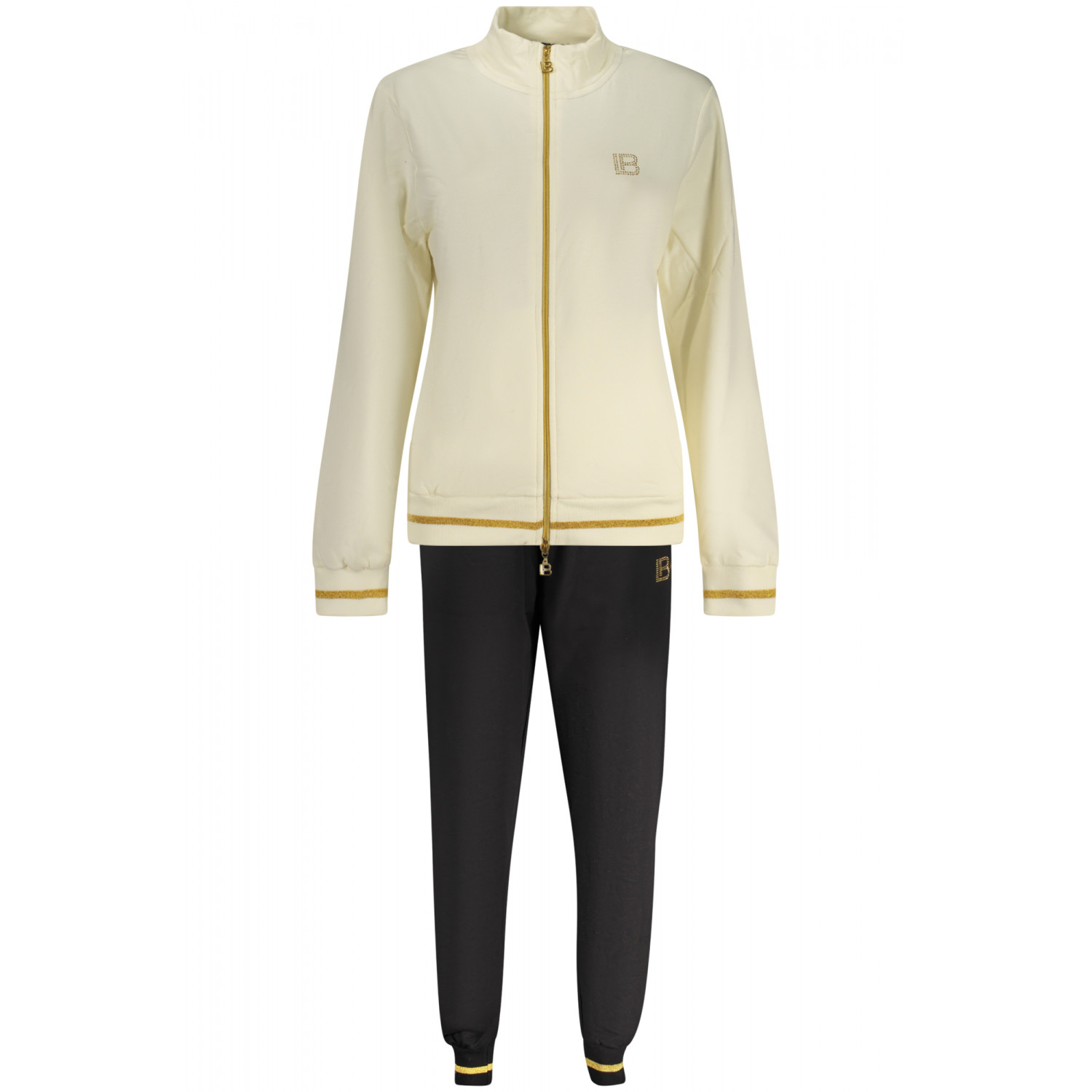 Trainingsanzug mit Sweatshirt, langärmeliges weißes Sweatshirt mit zwei Taschen und durchgehendem Reißverschluss, schwarze Hose mit elastischem Bund und Schnürung, kontrastierenden Details, Strassapplikationen und Logo.